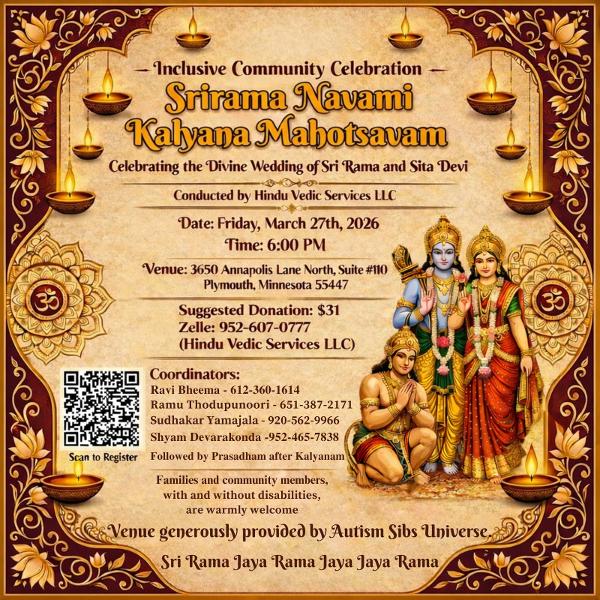 Hindu Vedic Services LLC is delighted to host a spiritual event, Sri Sita Rama Kalyanam dedicated to the welfare and prosperity of all. We cordially invite you and your family to join us in this auspicious celebration and receive the blessings of Lord Sri Sita Rama. To support this event and contribute to Hindu Vedic Services LLC.Please utilize the provided QR code for registration https://wkf.ms/4uschzM