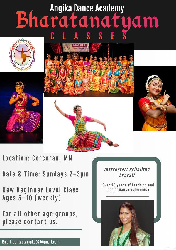 Angika offers lessons for at various levels from beginners to advanced. Angika also offers natuvangam training for their advanced level students. Classes are open for enrollment in Corcoran, MN. Classes are taught by Srilalitha Akurati, Lead Instructor of Angika Dance Academy.